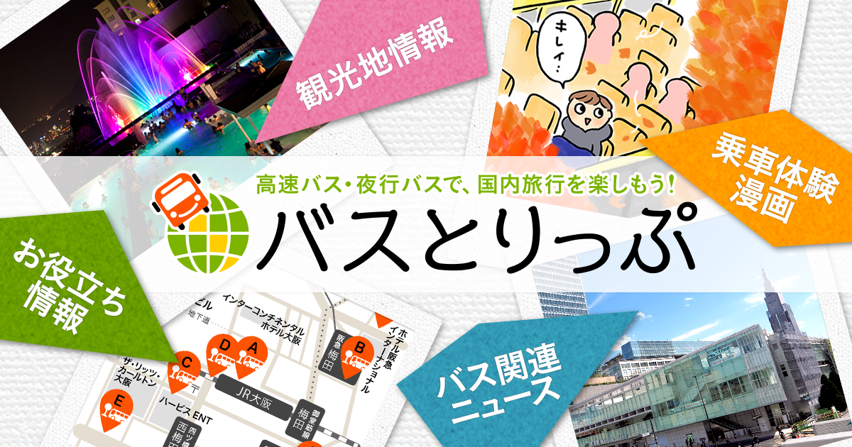 バスとりっぷ は、高速バス・夜行バスでより楽しく快適に出かけていただくための情報を配信している旅行・観光メディア。乗車記・体験漫画、スポット紹介、最新ニュース、お役立ち情報などを掲載しています。